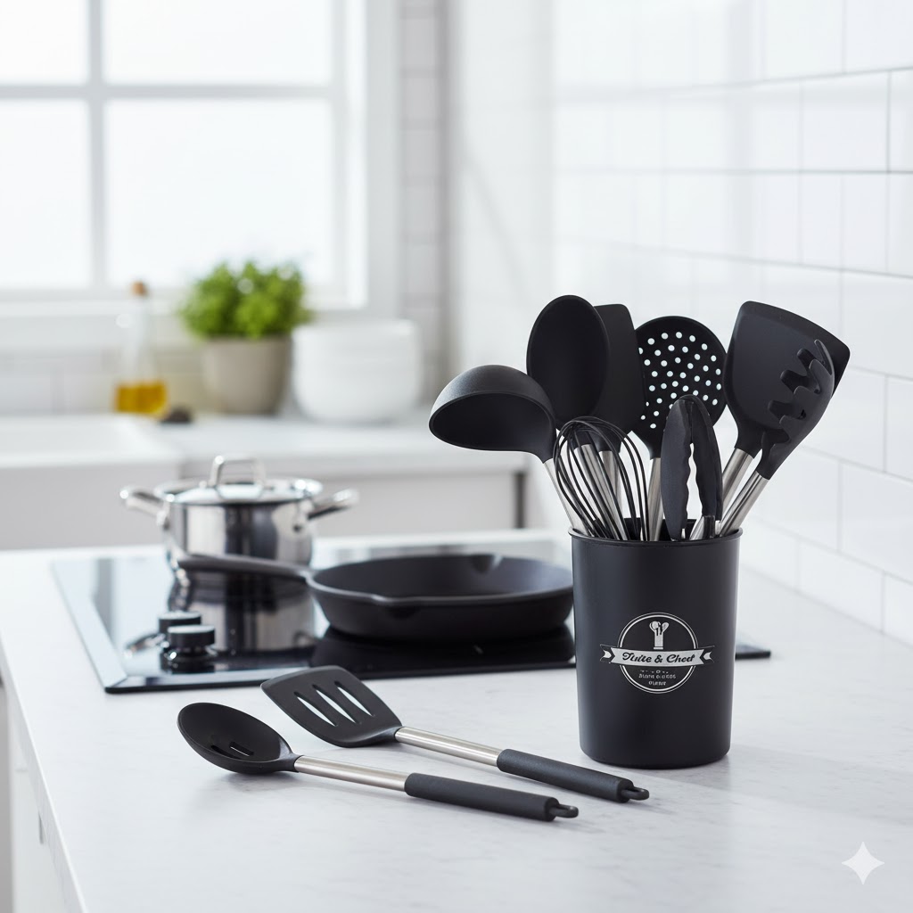 - This Premium Black 10-Piece silicone kitchen utensil set comes with all the necessary silicone spatula and silicone utensils required for meal preparation, baking or BBQing